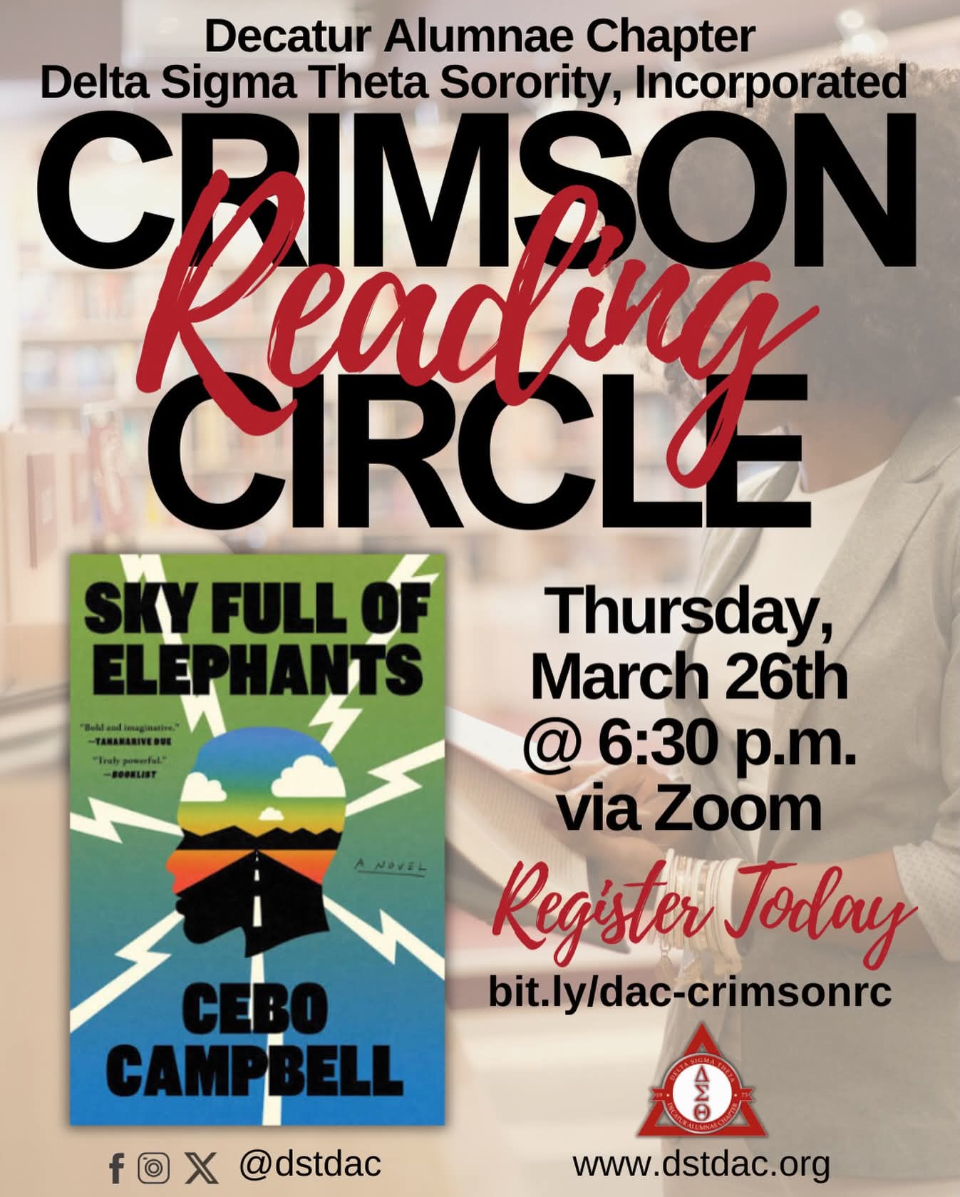 You’re invited to the Decatur Alumnae Chapter’s Crimson Reading Circle as we dive into A Sky Full of Elephants by Cebo Campbell. Together, we’ll explore the themes, perspectives, and powerful storytelling that make this work unforgettable! 📕